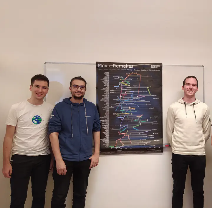 In this category TU Wien was represented by two submissions, both of which were created as part of the coursework for the lecture Graph Drawing Algorithms (taught by Martin Nöllenburg and Soeren Nickel ), with resounding success, winning a first and a joint second prize. Both groups chose the task of visualizing a graph of movie remakes by different directors out of the available data sets.